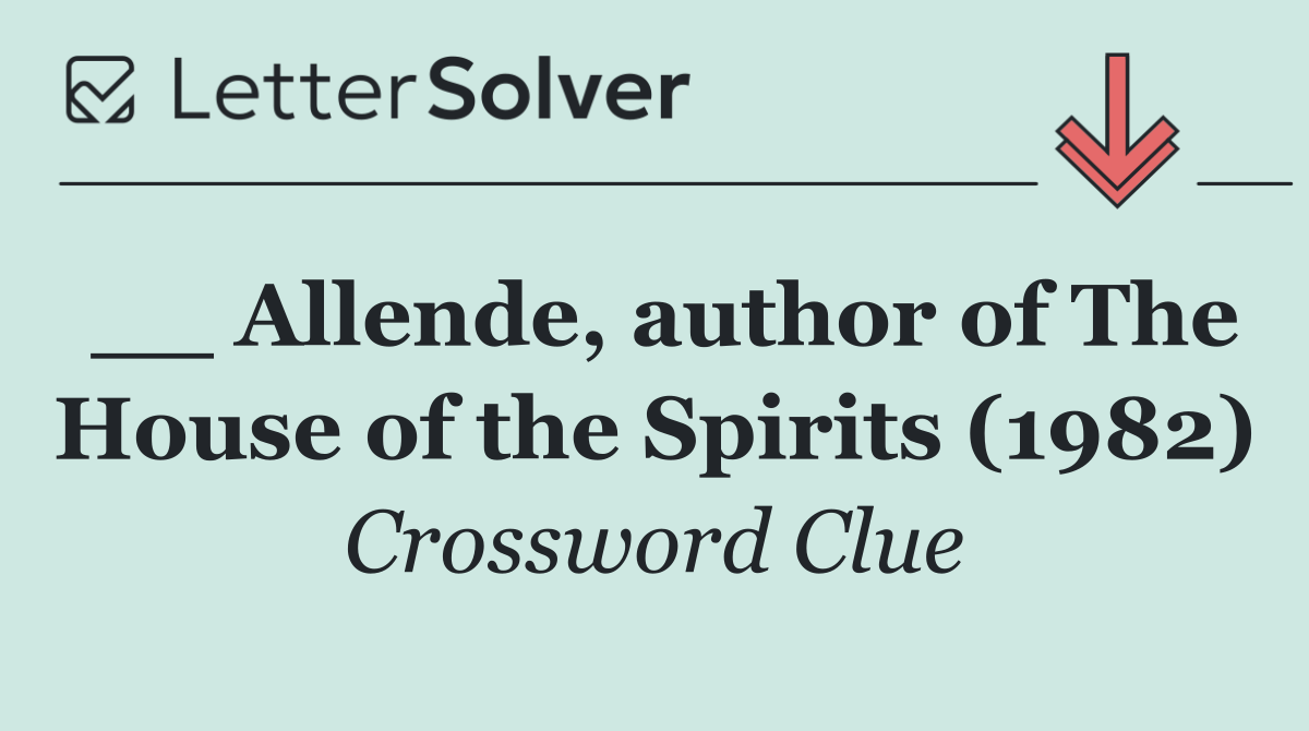 We specialize in solving many of your favorite puzzles, including the New York Times, USA Today, LA Times, Daily Themed Crosswords, and more. The "__ Allende, author of The House of the Spirits (1982)" clue from the Guardian Weekend puzzle, July 08 edition, is one such example.