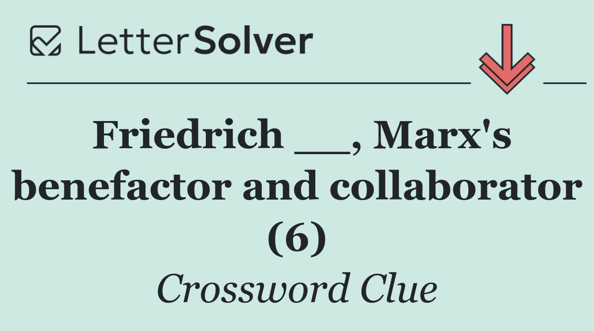 We specialize in solving many of your favorite puzzles, including the New York Times, USA Today, LA Times, Daily Themed Crosswords, and more. The "Friedrich __, Marx's benefactor and collaborator (6)" clue from the Guardian Weekend puzzle, June 29 edition, is one such example.