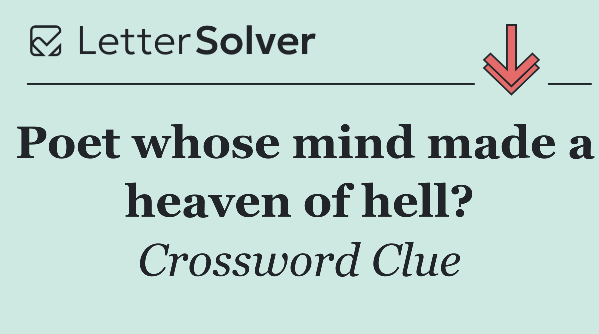 We specialize in solving many of your favorite puzzles, including the New York Times, USA Today, LA Times, Daily Themed Crosswords, and more. The "Poet whose mind made a heaven of hell?" clue from the Guardian Weekend puzzle, October 07 edition, is one such example.