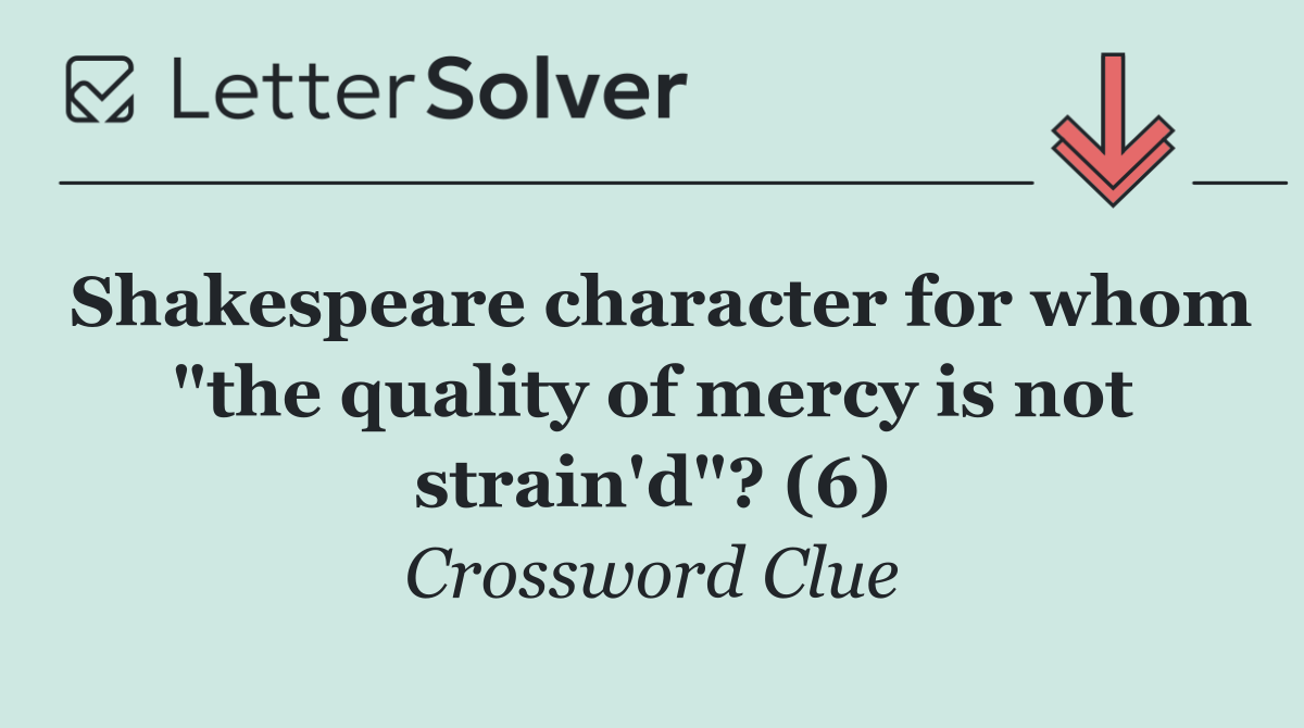 We specialize in solving many of your favorite puzzles, including the New York Times, USA Today, LA Times, Daily Themed Crosswords, and more. The "Shakespeare character for whom "the quality of mercy is not strain'd"? (6)" clue from the Guardian Weekend puzzle, May 11 edition, is one such example.