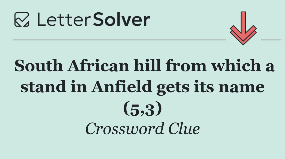We specialize in solving many of your favorite puzzles, including the New York Times, USA Today, LA Times, Daily Themed Crosswords, and more. The "South African hill from which a stand in Anfield gets its name (5,3)" clue from the Guardian Weekend puzzle, December 14 edition, is one such example.