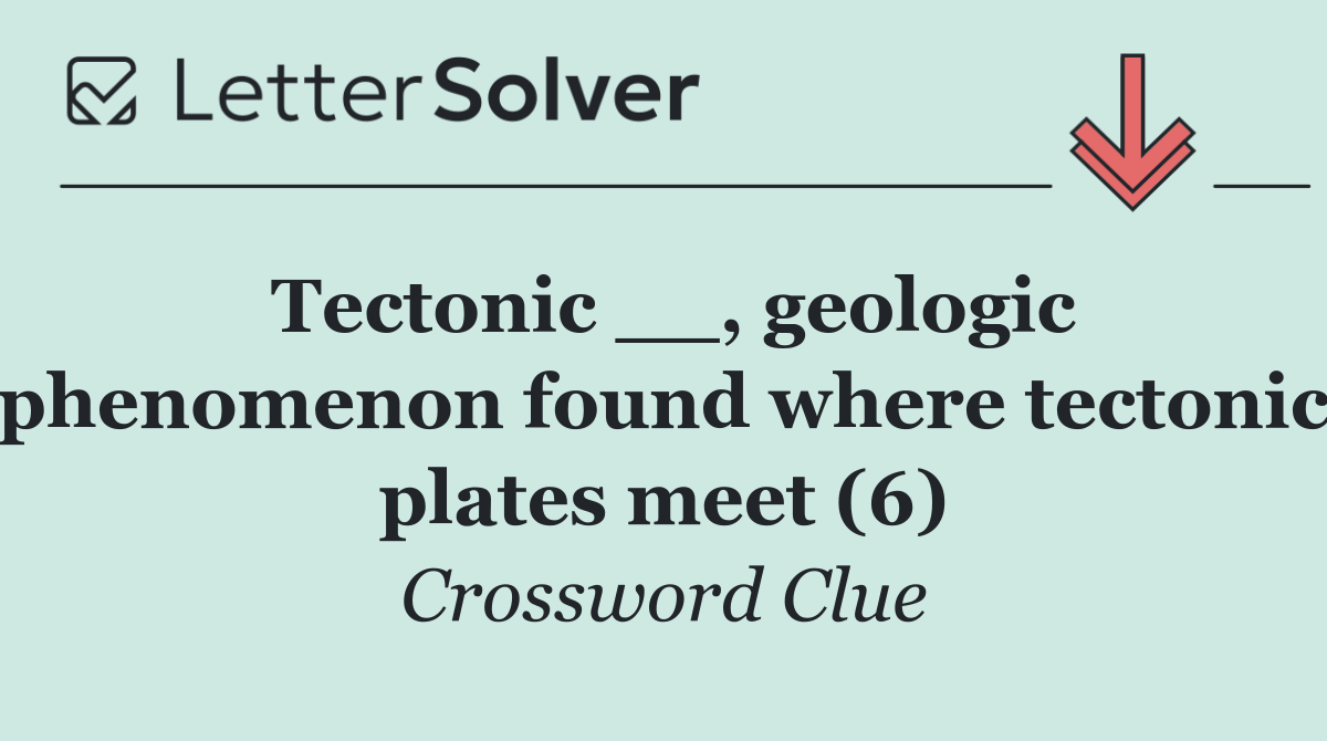 We specialize in solving many of your favorite puzzles, including the New York Times, USA Today, LA Times, Daily Themed Crosswords, and more. The "Tectonic __, geologic phenomenon found where tectonic plates meet (6)" clue from the Guardian Weekend puzzle, May 03 edition, is one such example.