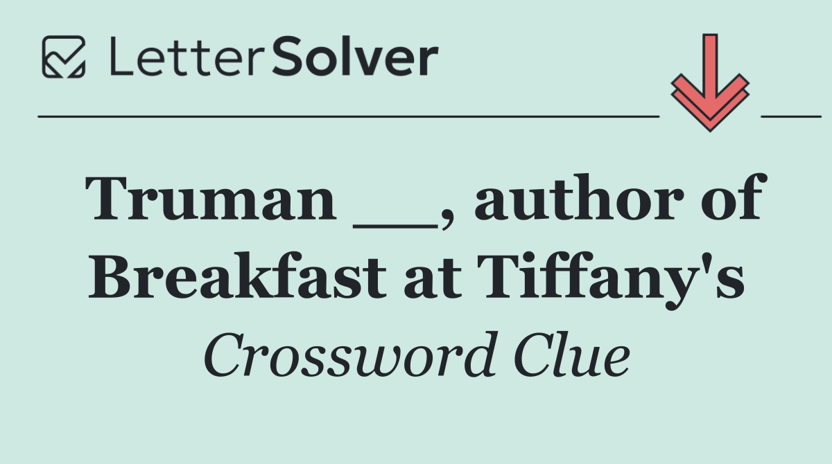 We specialize in solving many of your favorite puzzles, including the New York Times, USA Today, LA Times, Daily Themed Crosswords, and more. The "Truman __, author of Breakfast at Tiffany's" clue from the Guardian Weekend puzzle, January 07 edition, is one such example.