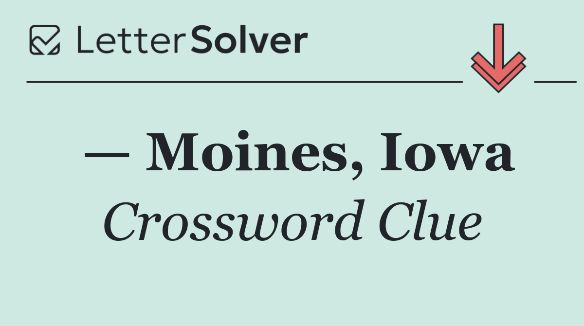 We specialize in solving many of your favorite puzzles, including the New York Times, USA Today, LA Times, Daily Themed Crosswords, and more. The "— Moines, Iowa" clue from the Premier Sunday puzzle, October 08 edition, is one such example.