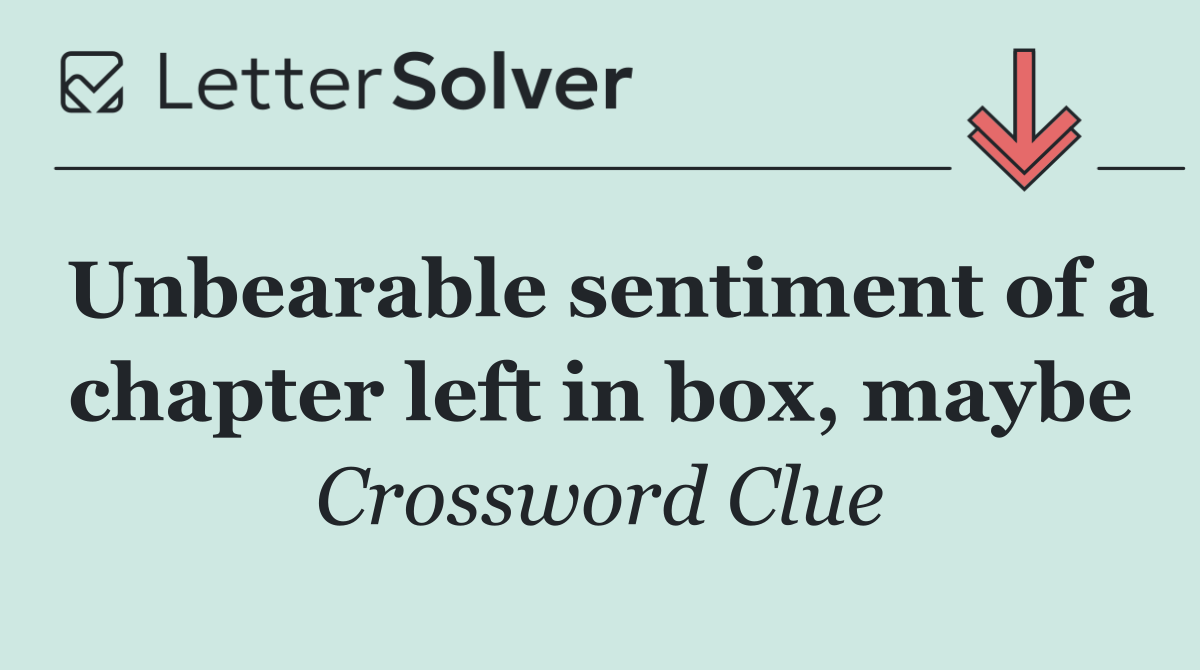 We specialize in solving many of your favorite puzzles, including the New York Times, USA Today, LA Times, Daily Themed Crosswords, and more. The "Unbearable sentiment of a chapter left in box, maybe" clue from the Telegraph Toughie puzzle, June 12 edition, is one such example.