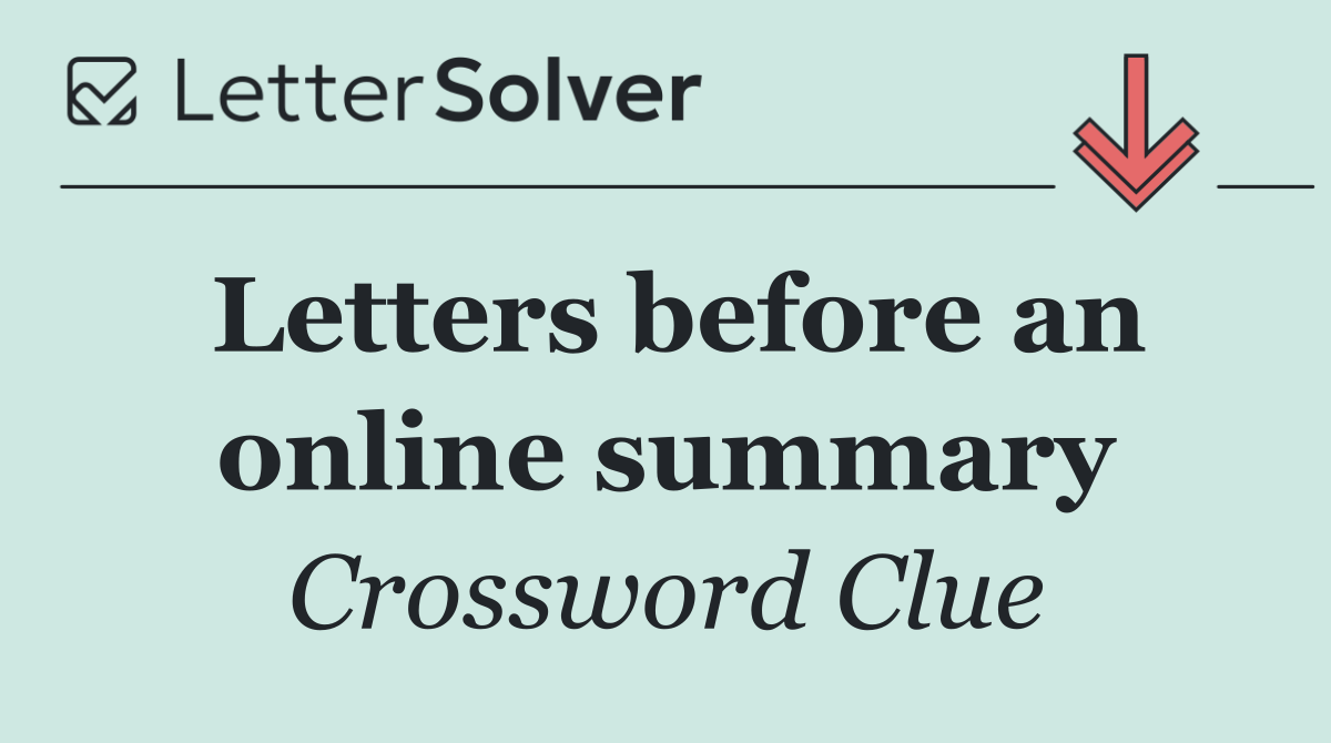 We specialize in solving many of your favorite puzzles, including the New York Times, USA Today, LA Times, Daily Themed Crosswords, and more. The "Letters before an online summary" clue from the Universal puzzle, November 03 edition, is one such example.